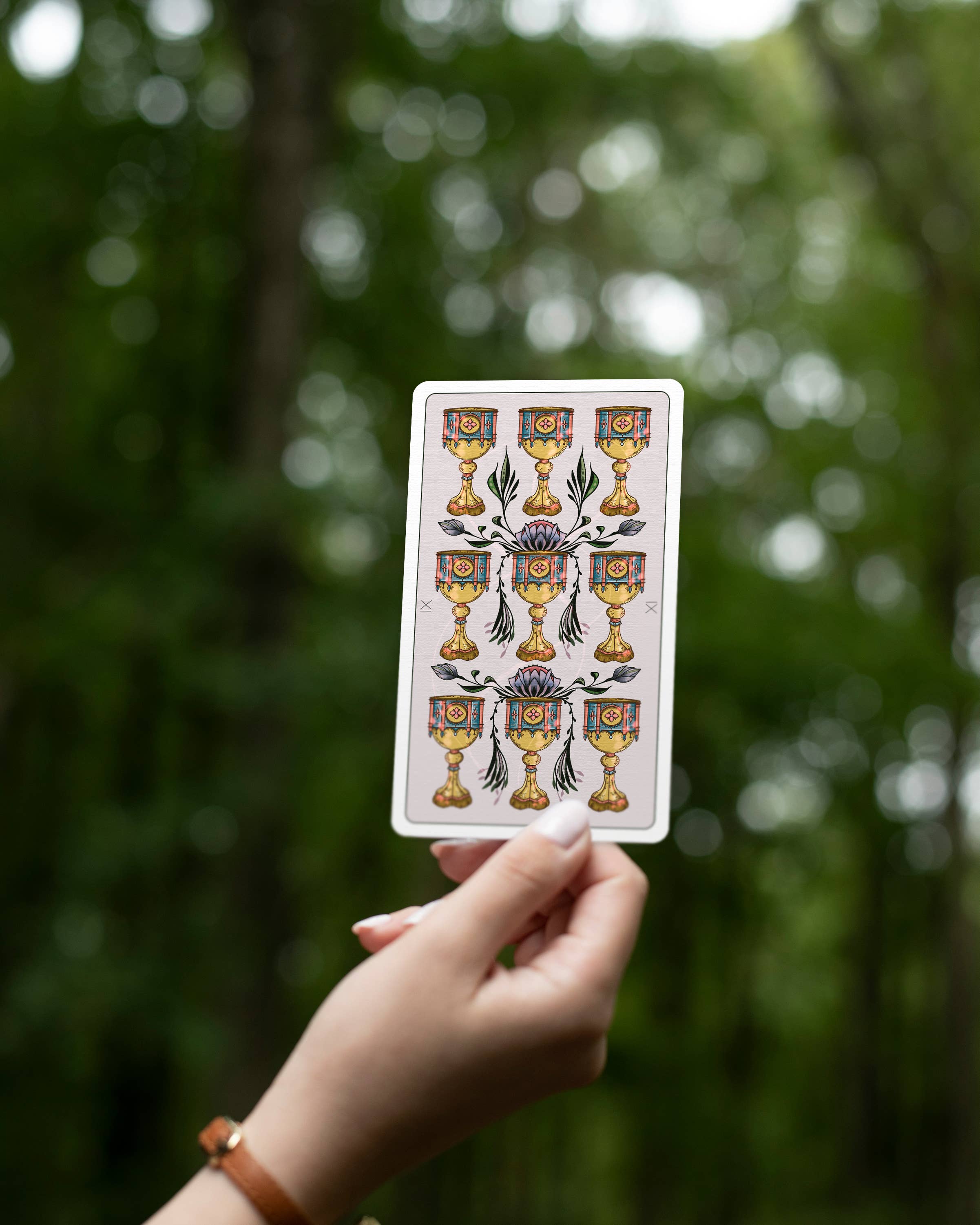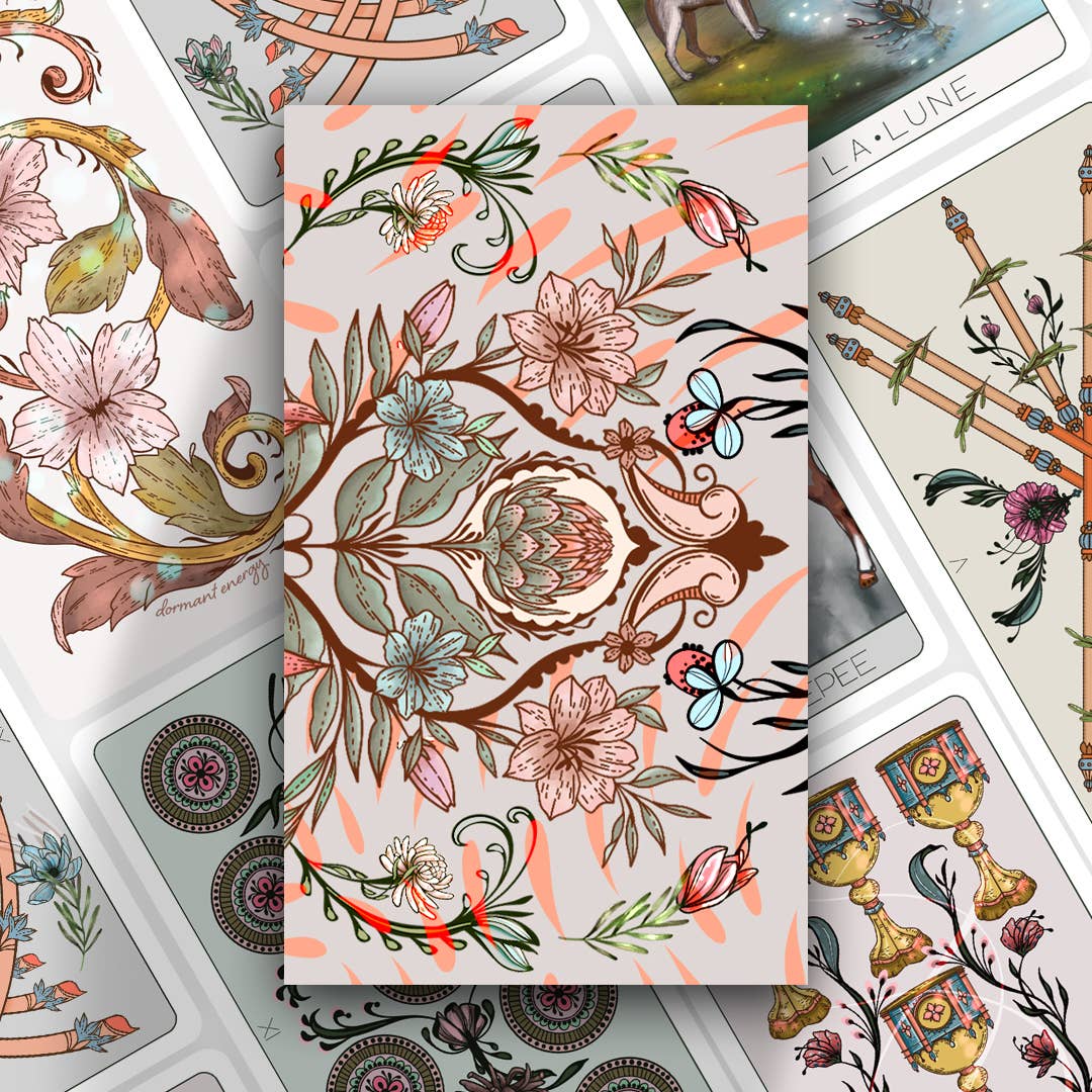 Inspired by the timeless beauty of the traditional Marseille deck, this reimagined version weaves together the enchantment of florals, nature, whimsical characters, and vibrant colors. Its energy is playful and inspiring, offering a lighthearted yet honest reflection of the centuries-old Tarot de Marseille tradition.